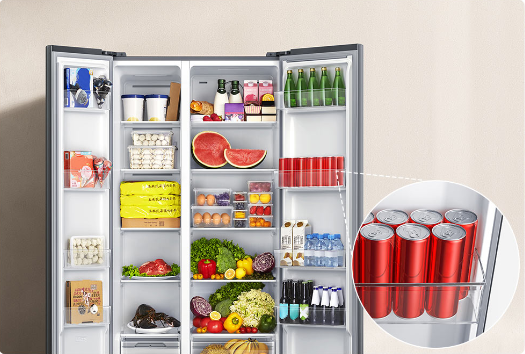 Một trong những điểm “ăn tiền” đầu tiên của tủ lạnh Xiaomi là dung tích lớn 630 L — rất phù hợp cho gia đình đông người hoặc nhu cầu lưu trữ nhiều thực phẩm trong thời gian dài. Dung tích này được chia hợp lý với ngăn lạnh khoảng ~407 L và ngăn đông ~223 L, tổng cộng khoảng 20 ngăn nhỏ & 6 ngăn kéo độc lập giúp dễ dàng sắp xếp thực phẩm theo từng nhóm.