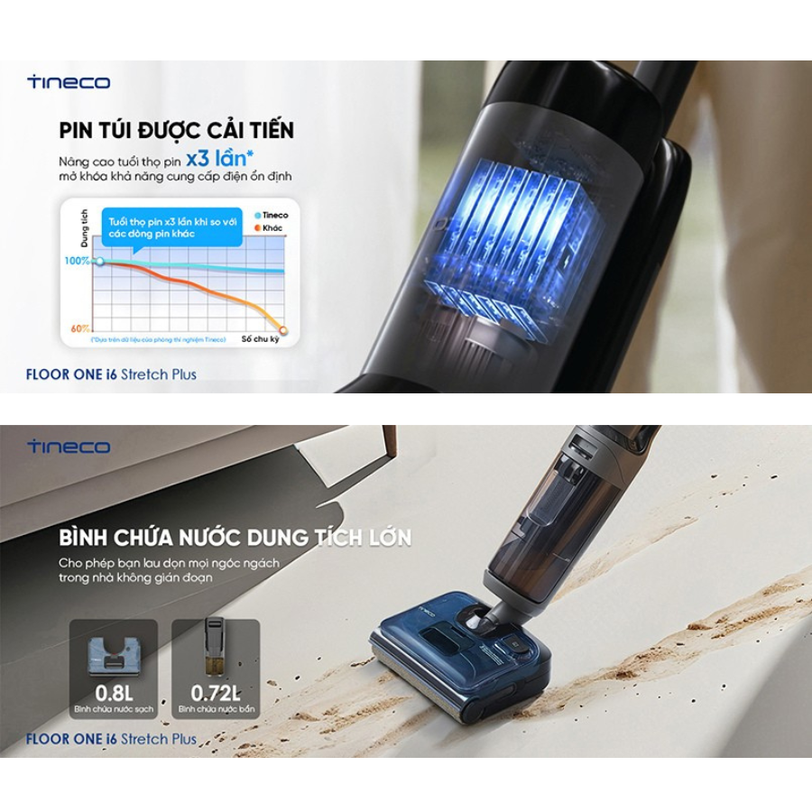 Bên cạnh đó, Tineco Floor One i6 Stretch Plus được trang bị bình chứa nước lớn với dung tích 0.8L cho nước sạch và 0.72L cho nước bẩn, giúp làm sạch các khu vực rộng mà không cần thay nước thường xuyên – mang lại trải nghiệm dọn dẹp liên tục, tiết kiệm thời gian và công sức.
